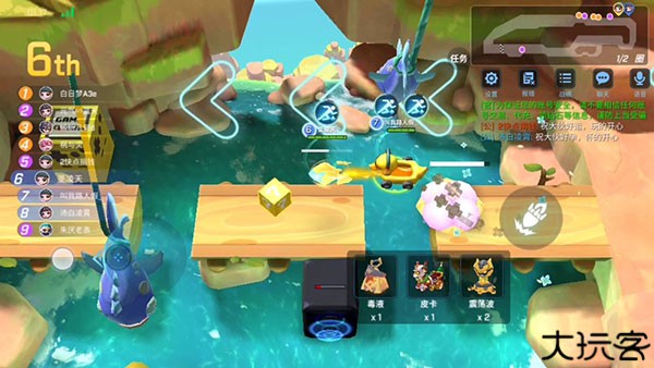 此区域有两部分,且障碍均为摇摆类(逃跑吧少年官方把它叫做“咸鱼大摆锤”),在较低的水面上用跳高类的道具会被攻击到。从桥上走是很好的选择,水面也不差。第一部分摆锤的空隔,利用捣弹和皮卡的高速度可以直接开过去,小心不要被打到就是了。用跳高或是滑板也可以跳过摆锤,放心,绳子是没有伤害滴。第二部分用载具过比较靠运气,建议走水路,从水路走的话,可以用飞爪抓对岸的石头快速移动,或者是震荡波向前位移。