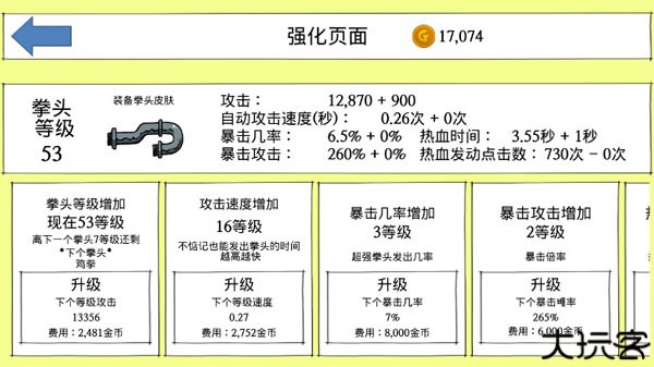 持续战斗收集金币,升级拳头解锁更多战力潜能。