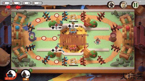 点击游戏界面中间的加减号图标可以派遣与收回工人。上下路的资源为食物,路程较短,采集时间较短;中路的资源为黄金,路程较长,采集时间较长。