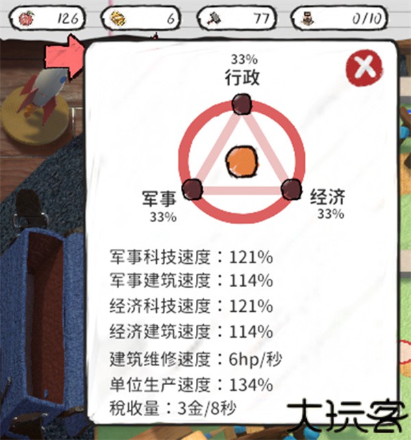 生产力流向有三个方向:军事、经济、行政。可以在该面板中查询当前生产力的收益。
