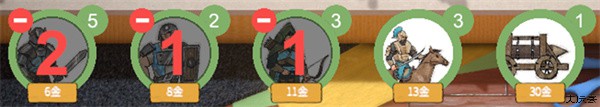 在游戏界面下方可以看见您的士兵图标,下方黄色方框代表该兵种价格,右上角代表可派遣士兵数量。