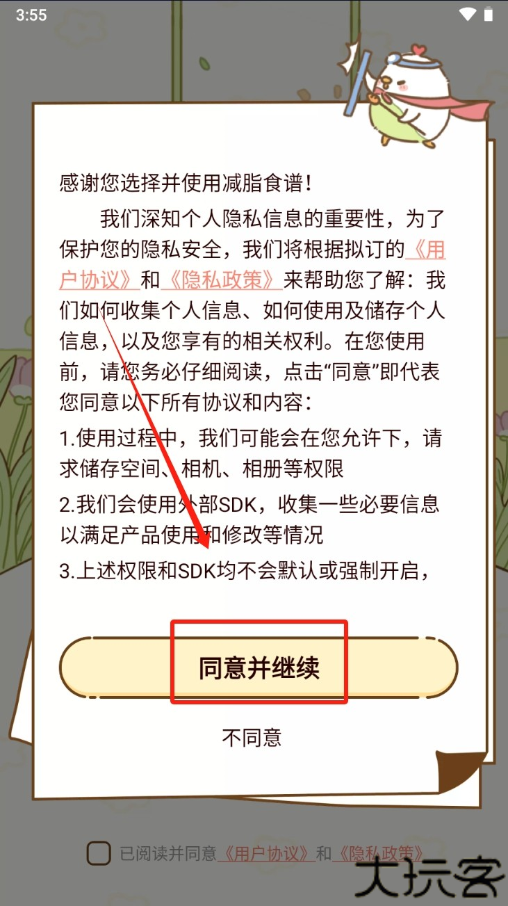 1、打开进入咕咕轻断食app里,可以去阅读并同意《用户协议》和《隐私政策》在去同意并继续。