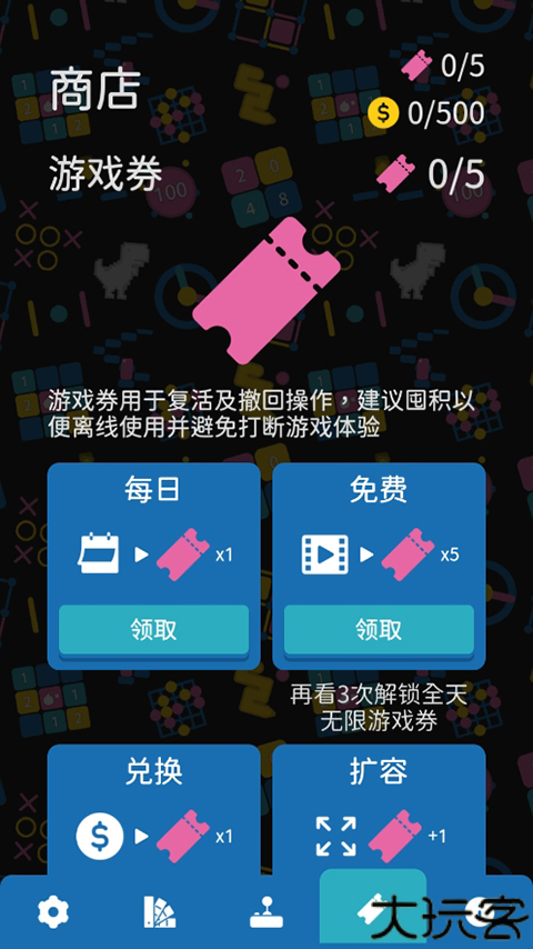 2、游戏券可以用于复活及撤回操作。通过每日刷新、金币兑换或观看广告获取。