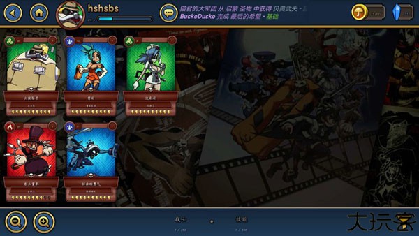 在收藏页查看已解锁角色与技能,使用放大镜查看详情并进行升级强化。