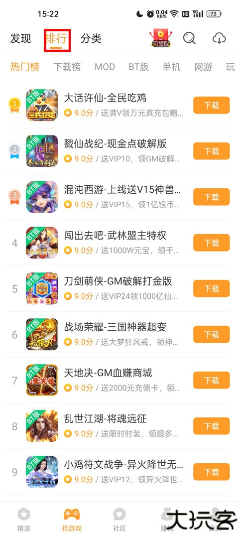 2、点击排行,有热门榜、下载榜、bt榜、单机榜等,可以找到喜欢的游戏。