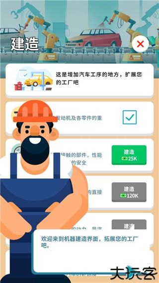 1、卡通风格的造车模拟游戏,玩家从流水线工人到汽车行业大亨,展开崛起之路。