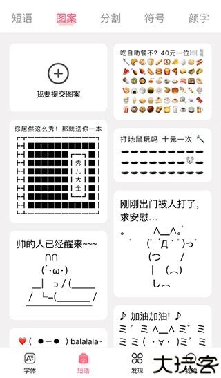 特殊字体生成器app集成了各式字体、颜文字符号的特殊文字来进行使用。根据需求一键的去生成几十种漂亮特殊字体,包括英文小字体、手写体、花体字、可爱字体等等可以进行选择使用。让沟通变得更生动交流更有趣,支持各种文字在线生成随时创意组合生更加特别的文字内容。特殊字体生成器app下载安装后就能够在线的去制字体,包含常用花式短语、颜文字、小辫子、Emoji等超多素材。