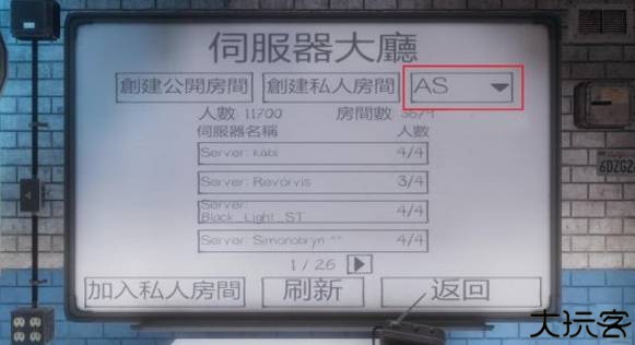 首次联网后点击大厅左上角“在线的”,等待载入可用房间。
