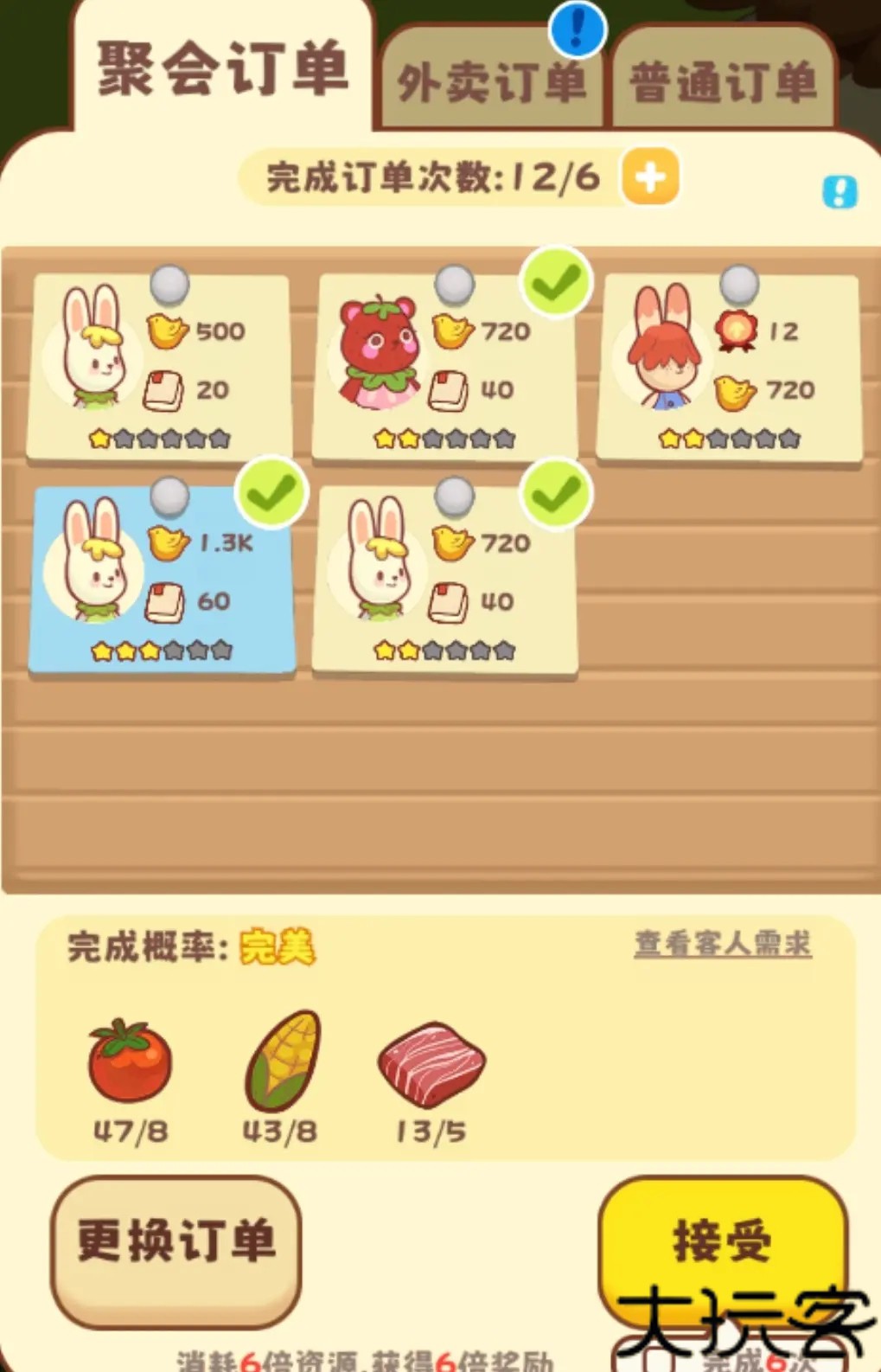 2、完成聚会订单,星级越高,币越多,每天可以刷新6次。