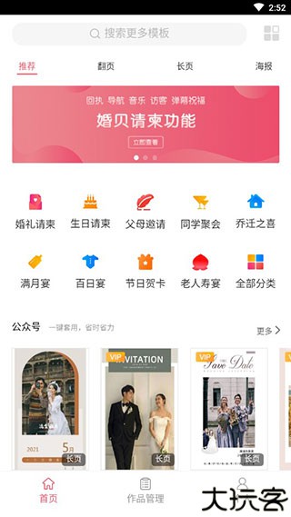 1、专为各种庆祝活动设计的电子请柬,拥有婚礼请柬、宝宝满月、生日贺卡等丰富场景模板。