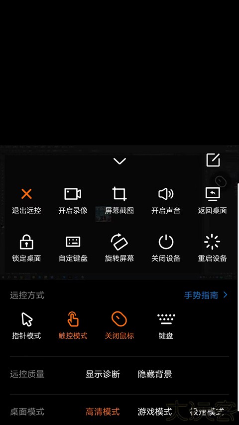 8、选择右下角【箭头】图标,可进行【退出远控】、【开启录像】、【屏幕截图】等快捷操作以及对远控方式、指针模式、远控质量、桌面模式的设置。