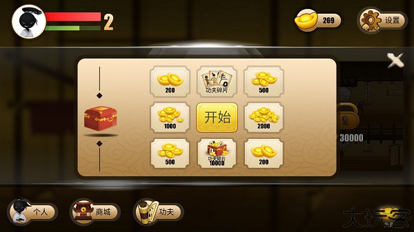 点击右下角的“元宝”便可打开转盘,点击“开始”,随机获得200,500,1000,2000等不同数量的元宝奖励,期间还有机会获得功夫碎片。