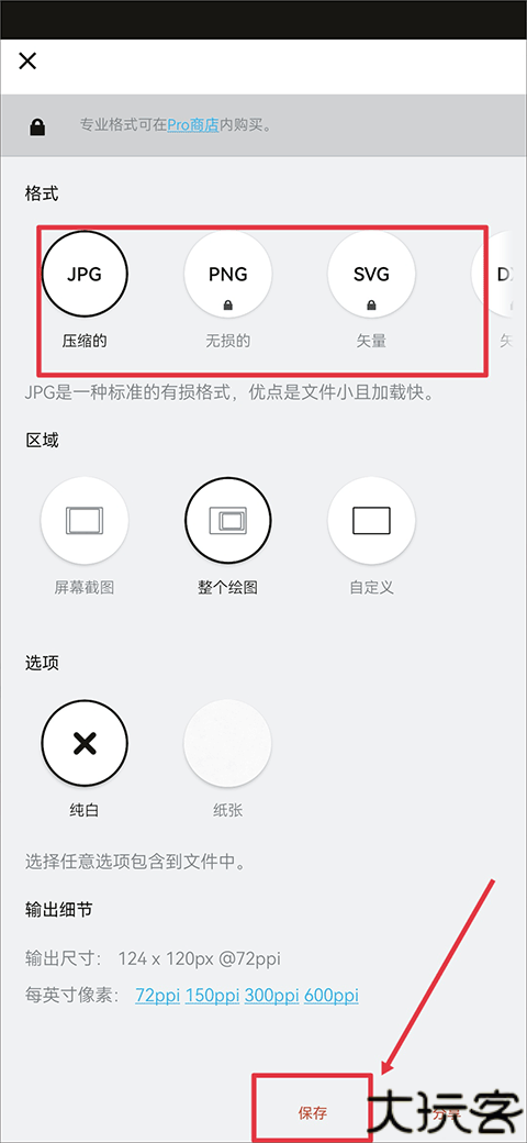 9、然后在导出界面中选择自己要导出的格式,并点击保存就可以将绘画完成的作品导出到手机内啦。
