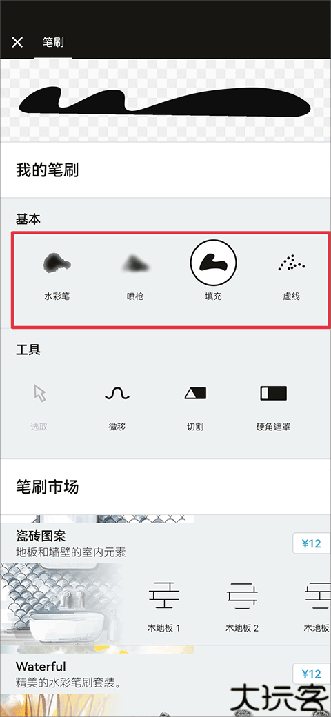 2、颜色选取后再次点击填充功能以进入笔刷界面,并选择自己喜欢的笔刷进行填充,选择不同的笔刷填充的方式也不同。