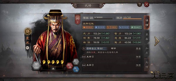 1、袁术文武兼修,武智成长优越,骑弓双适,主将能力稳定且全面。