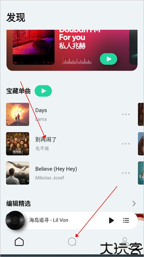 点击个人喜欢的曲目进行播放,或在底部搜索栏查找音乐。