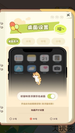 启用悬浮窗显示功能,猫咪才能在所有页面随时现身。
