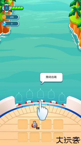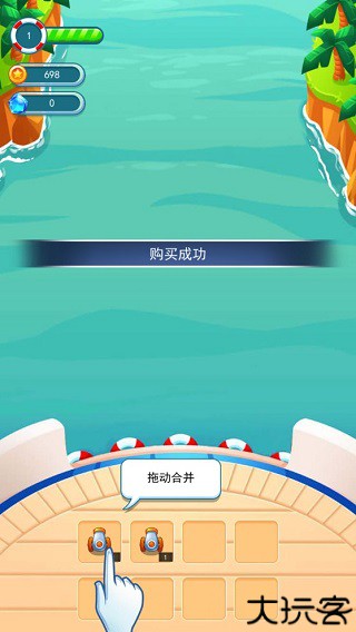 5、玩家通过合成炮塔,建立自己最强的炮台阵容,以抵御海盗攻击,保卫自己的船只。