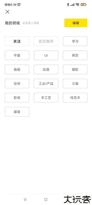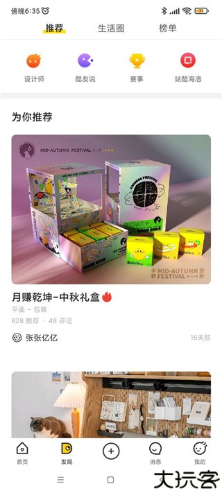 1、有首页、关注等板块,与平台同步更新优秀设计和创意内容。