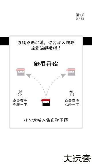1、向左向右来去点击一下屏幕小方块就向上跳动下。