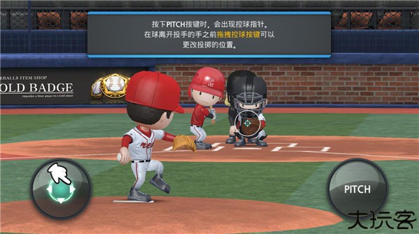 2、在按下右方的pitch按键时,会出现控球指针,在球离开投手之前拖曳控球按键可以更改投掷的位置。