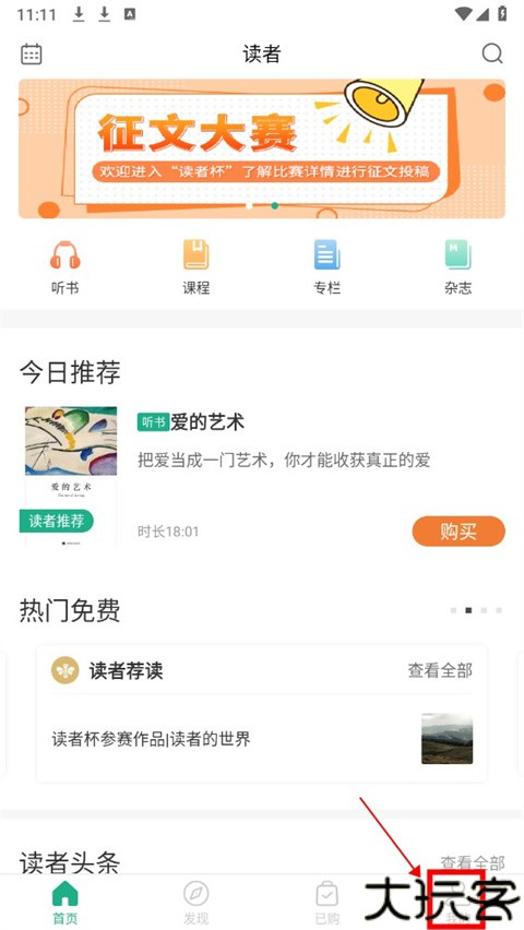 2) 首页新增了“读者听书”内容板块,板块中包含丰富的图文、音频内容可正常播放,需要开通会员或充值虚拟币购买打开。