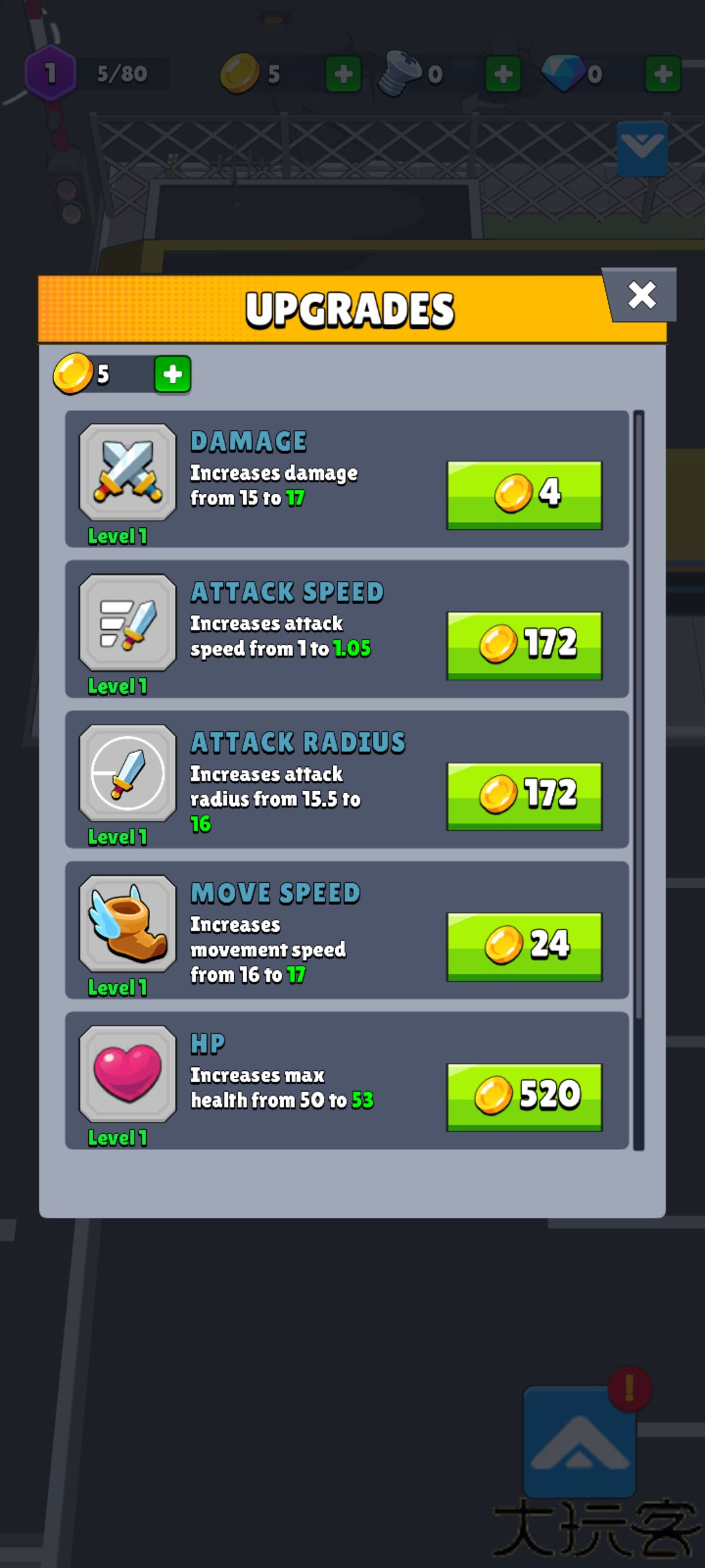 3、在升级界面里,玩家目前有5个金币,可以初始买一个伤害加成。
