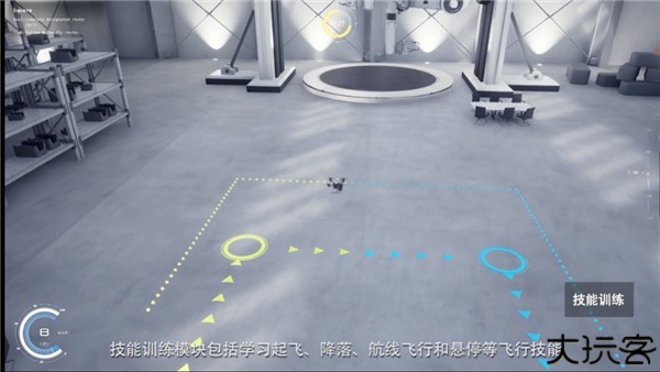 1、进入游戏后,就会进入室内教学模式,教你如何起飞降落,航线飞行,悬停等内容。