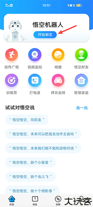 打开悟空机器人App,登录后在“乐园”页面点击上方的绑定按钮。