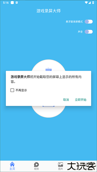 2、按照需求选择竖屏录屏还是横屏录屏,需要给予软件权限,才能点击立即开始。