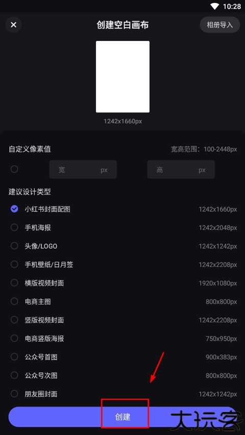 2、点击手机海报,然后创建,并允许自定义像素值。