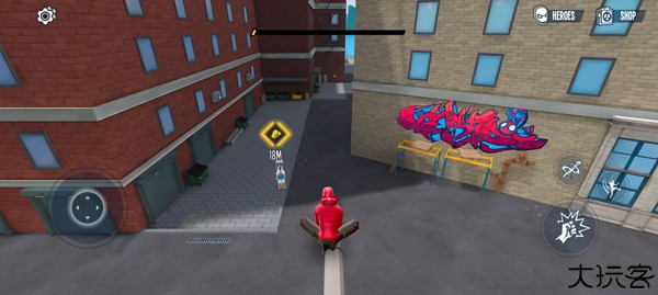 4、游戏采用了全3D自由视角,屏幕左侧摇杆控制移动,右边则为攻击、发射蜘蛛丝、跳跃等键位。