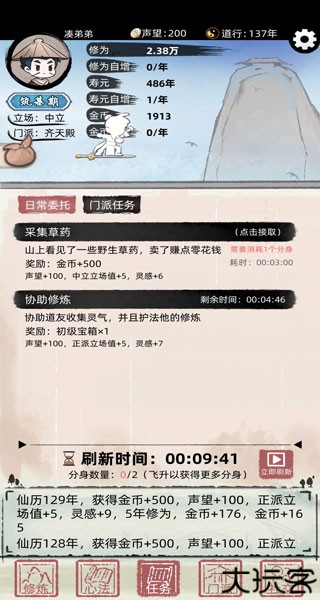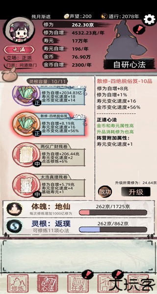 1、开局优先选择正派门派,因正道心法可带来寿元及金钱收益。