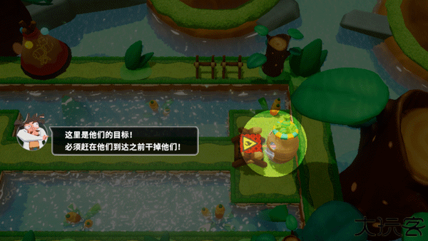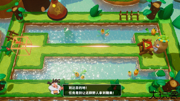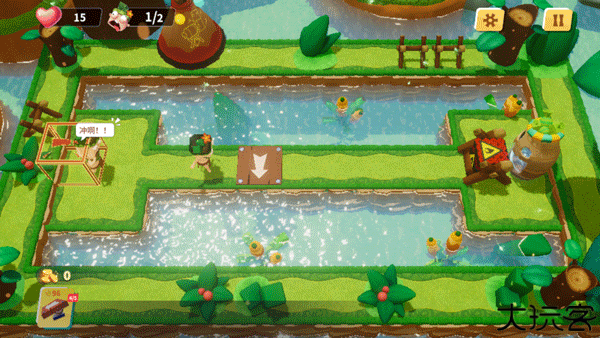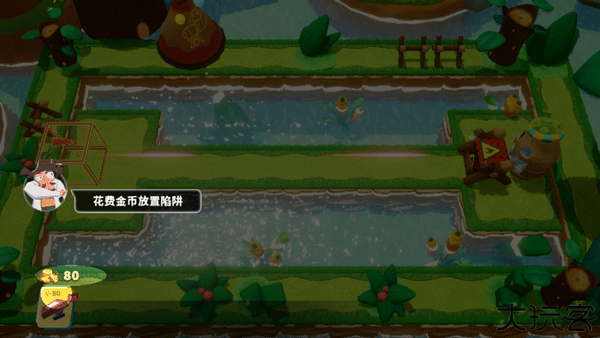 6、将金币拖到路上,布置陷阱,将野人弹到河里去。