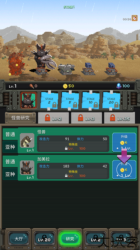 3、点击研究功能,可以提升怪兽的实力,需要耗费一定的资源。