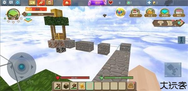 打开背包,使用收集到的圆石或者其他方块,铺一条阶梯,就可以顺着阶梯到达其他空岛,每一个空岛都有一个宝箱,藏着丰厚奖励,等玩家探索。