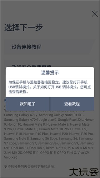 3、选择好无人机设备后,为保证手机与遥控器之间的连接更稳定,用户还需要开启手机的USB的调试模式,用户也可以点击查看教程进行深入学习。