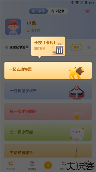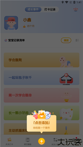 1、可以综合宝宝的年龄段以及兴趣爱好,展示100件富含趣味的事件记录宝宝成长过程中意义十足的节点,寓教于乐。