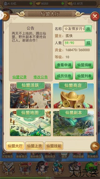 加入组织进入活跃仙盟可获取大量战力养成资源,若未找到合适仙盟亦可创建专属帮派。