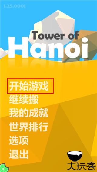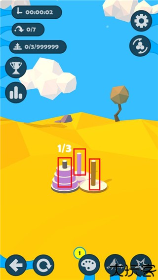 2、进入游戏后,玩家可以看到三根木桩,而在木桩的上面有着三个圆柱体,玩家只要将它从大到小的依次放在相同颜色的木桩即可完成挑战。