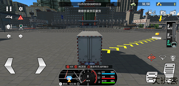 驾驶卡车抵达装货区,挂档倒车定位,完成装载。