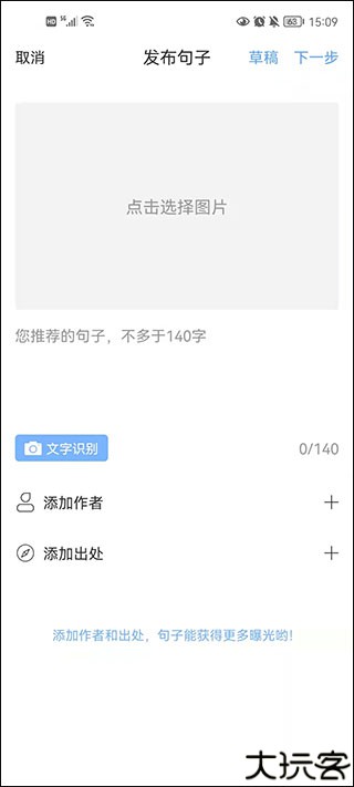 2、在发布句子的页面,用户需要输入想要发布的句子以及配图,如果发布的句子本身有作者或出处的话,也可以添加上去。