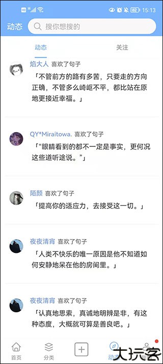 5、用户在动态中可以随时随地的去发布自己的句子,从中遇到很多一样喜欢发句子的朋友,用户可以尝试与他们交流。