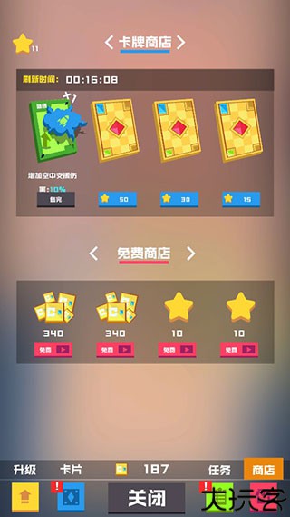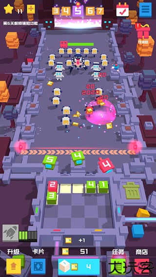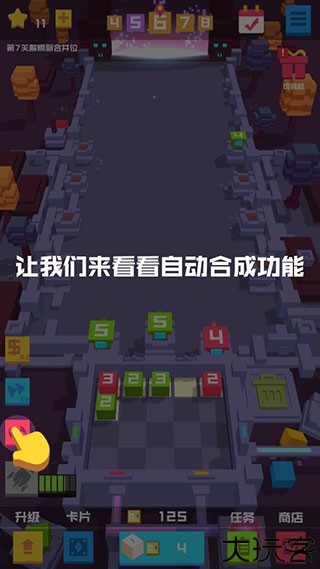 解锁自动合成功能后可轻松升级方块,商店提供宝币与强化卡牌。
