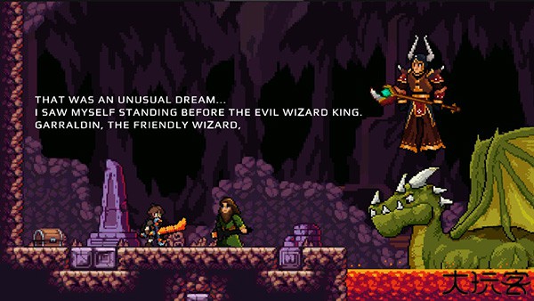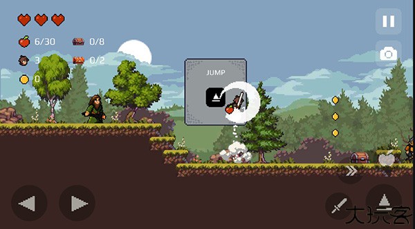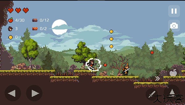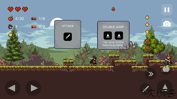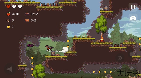 8、靠近敌人时使用剑攻击,远距离时可以投掷苹果,苹果攻击力会随着升级而增强,通常两下就能击败一个小怪。