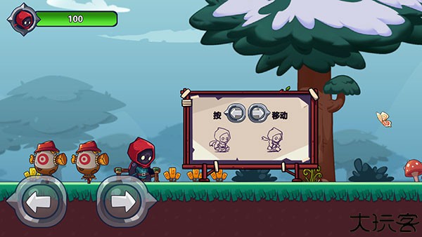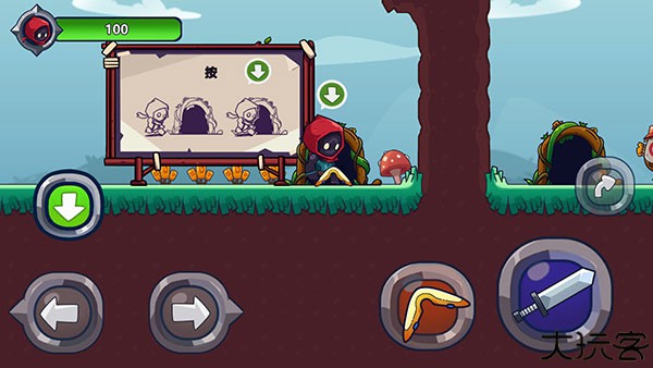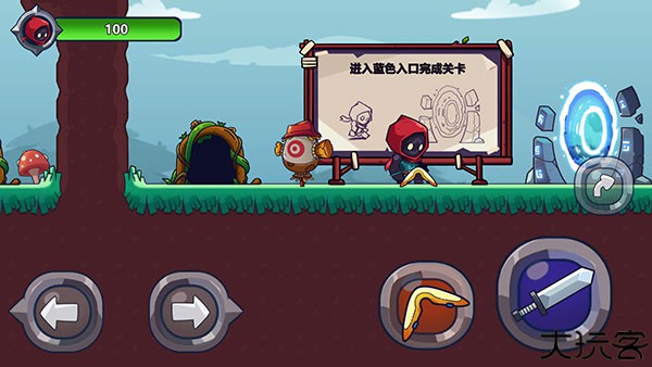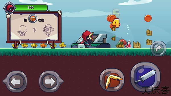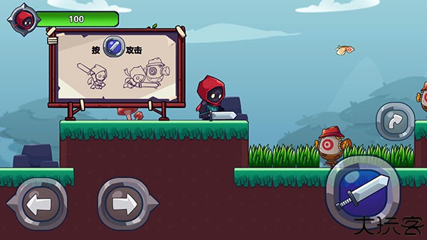 3、右下角的剑按钮是攻击键,是近战攻击的绝佳武器,可以用稻草人试试威力。