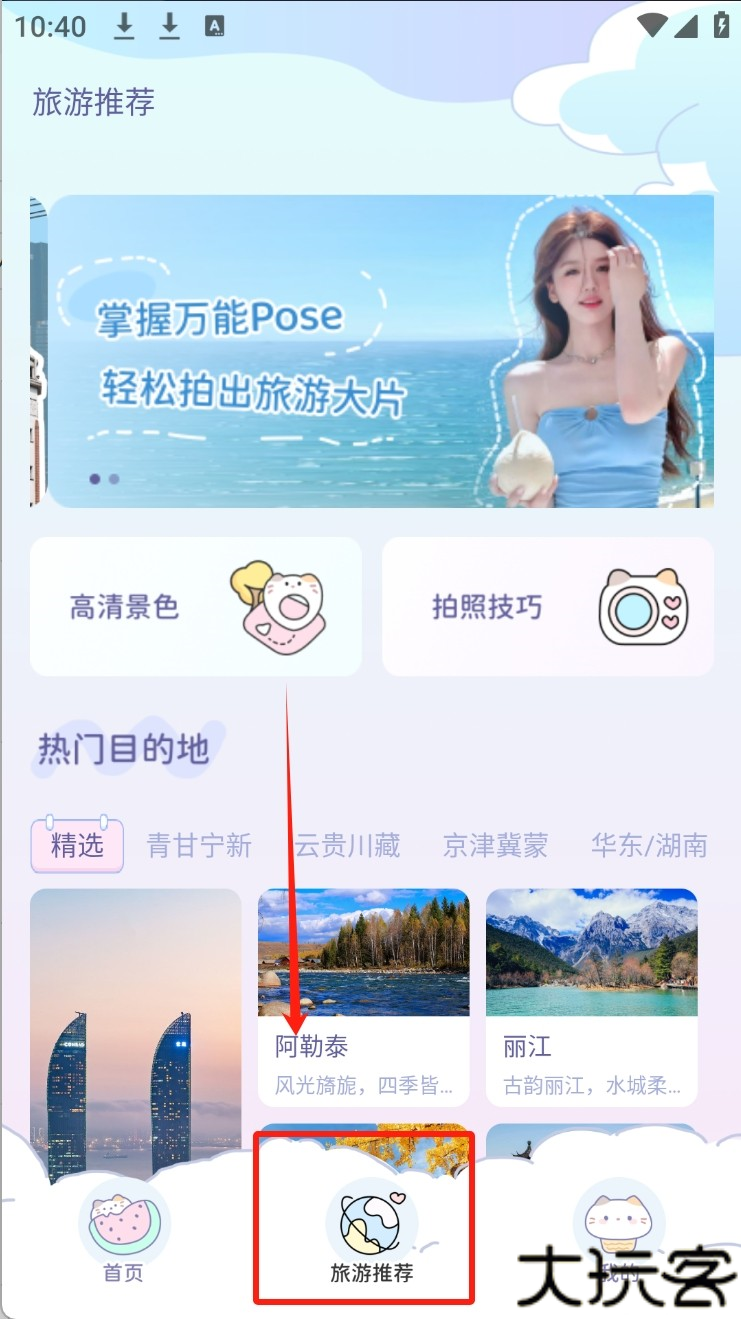 2、点击旅游推荐,你就可以获取拍照技巧和热门地点。
