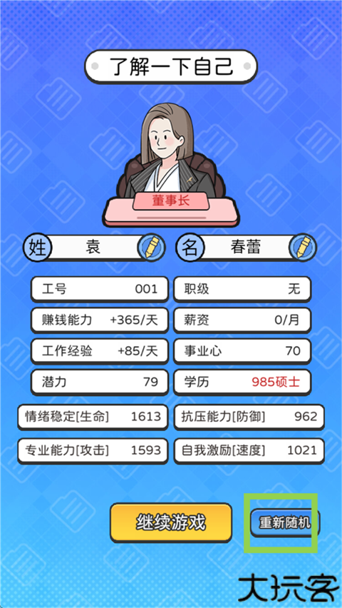 1、进入游戏先设定自己的基本属性,不满意可以点击随机重新生成。