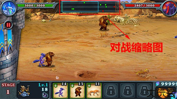 3、进入游戏战斗页面后,玩家只需把卡牌拖到对战场上就OK了,观察上方的对战缩略图,可以查看对方来敌的数量,可提前先做好准备。