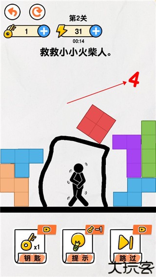 1、游戏开启后,画出线条保护火柴人,时间结束时无伤即视为成功。